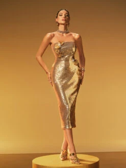 Turn heads in the Jaelith Strapless Flower Sequin Midi Dress. This elegant midi dress features a strapless neckline and intricate flower sequin detailing that adds a touch of sparkle and femininity. Its flattering silhouette enhances your natural curves, making it perfect for special occasions or glamorous evenings. Step out with confidence and grace in this stunning statement piece.