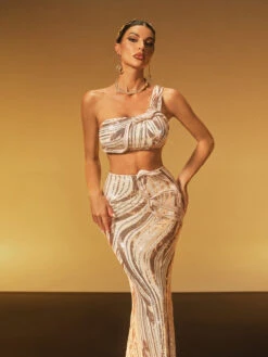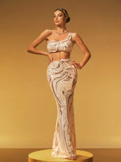 Shine brilliantly in the Jaelthar One Shoulder Sequin Skirt Set. This chic ensemble features a sleek one-shoulder top paired with a dazzling sequin skirt, creating a perfect blend of modern style and glamorous sparkle. Designed to flatter your figure, it’s ideal for making a bold statement at any special occasion or night out. Elevate your wardrobe with this stunning, confident look.