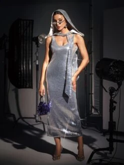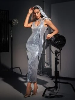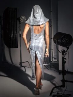The Jafna Dress is the perfect partywear ensemble. Crafted with luxurious silver sequins, the drape back hooded style will make you a showstopper. It’s sure to ensure a captivating look for any special occasion.