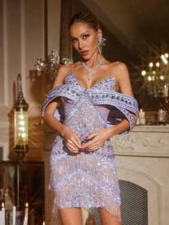 The Jaimarie Off Shoulder Rhinestone Fringe Mini Dress is the perfect combination of glamour and sass. With its off shoulder design and rhinestone detailing, you’ll be turning heads wherever you go. The fringe detailing adds a touch of fun and movement to this dress, making it a must-have for any special occasion.