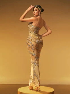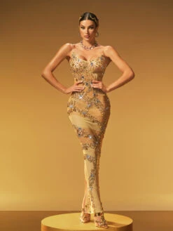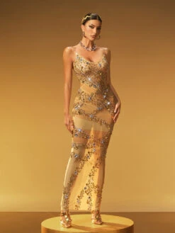 Elevate your evening look with the Jaldris Crystal Split Mesh Maxi Dress. Featuring a delicate mesh fabric adorned with sparkling crystals, this dress offers a graceful silhouette and a daring split for added allure. Perfect for special occasions, it combines elegance and confidence to make you stand out effortlessly.