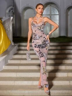Be the star of any event in our Jynvira Spaghetti Rhinestone Acrylic Mesh Maxi Dress! This stunning dress features delicate spaghetti straps and a mesmerizing rhinestone design that will catch every eye. The lightweight and breezy acrylic mesh material will keep you comfortable all night, while also adding a touch of glamour to your look. Elevate your style and make a statement with this must-have piece!
