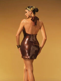 Dazzle in the Jyrthos Halterneck Crystal Sequin Mini Dress. Featuring a sleek halterneck design adorned with sparkling crystal sequins, this mini dress offers a radiant and sophisticated look. Its flattering fit highlights your silhouette, making it perfect for parties and special occasions where you want to shine. Step into the spotlight with confidence and elegance in this stunning dress.