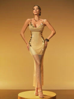 Glow with elegance in the Kaelvix Spaghetti Rhinestone Mesh Maxi Dress. Featuring delicate spaghetti straps and shimmering rhinestone accents on sheer mesh, this maxi dress offers a perfect blend of sophistication and sparkle. Its flowing silhouette flatters your figure, making it ideal for special occasions where you want to leave a lasting impression. Step into glamour and confidence with this stunning dress.