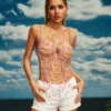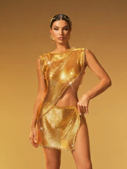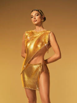 Command attention with the Kexmir Sleeveless Chainmail Skirt Set. This striking ensemble features a sleek sleeveless top paired with a shimmering chainmail skirt, blending edgy metallic shine with modern elegance. Perfect for making a bold impression at any event, the set offers a confident, fashion-forward look that moves with you. Elevate your wardrobe with this standout duo designed to turn heads and showcase your unique style.
