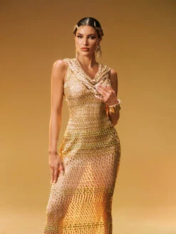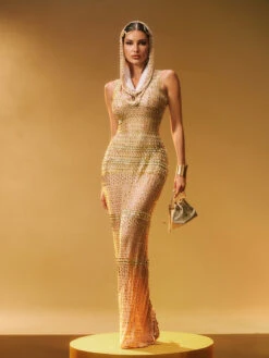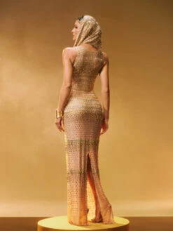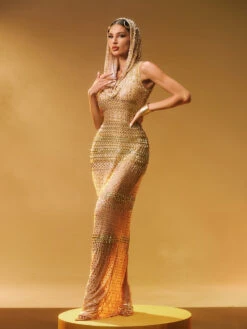 Elevate your style with our Kivin Sleeveless Rhinestone Mesh Maxi Dress. The stunning rhinestone embellishments and lightweight mesh material will make you stand out in any occasion. Make a statement and feel confident in this must-have dress!