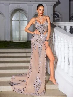 Experience elegance and glamour with our Kyrissa Strapless Embellished Split Mesh Maxi Dress. Be the center of attention with the intricate detailing and flowing silhouette. Perfect for weddings, proms, or any special occasion. Make a statement and turn heads with this stunning dress!