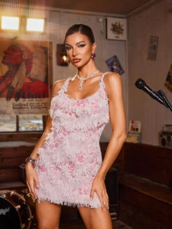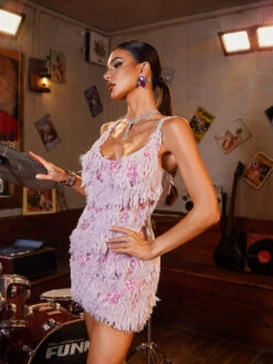 Make a stunning entrance in the Laldor Plunge Neck Sequin Fringe Mini Dress. Featuring a daring plunge neckline and shimmering sequins, this dress catches the light with every move. The playful fringe adds dynamic flair, perfect for dancing the night away. Ideal for parties or special events, it combines bold style with captivating elegance to ensure all eyes are on you.