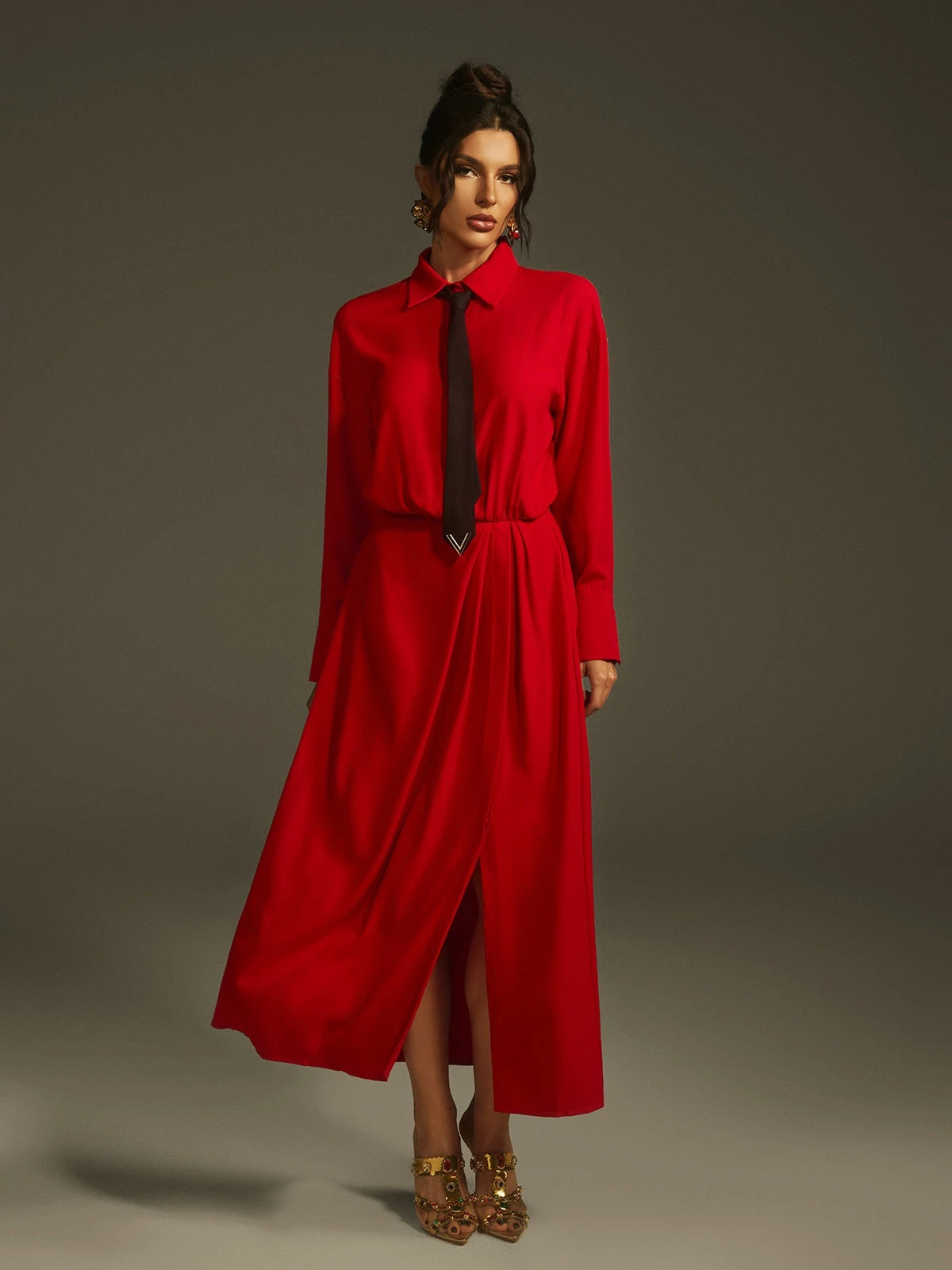Discover timeless sophistication with the Lamech Folded Collar Split Maxi Dress. This elegant dress features a chic folded collar and a daring side split that adds a touch of allure to its flowing silhouette. Perfect for formal events or stylish evenings out, it combines comfort and grace to ensure you stand out with confidence and poise.