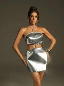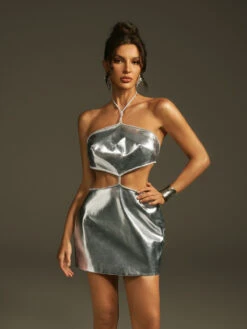 Turn heads with the Lavonna Halterneck Metallic Mini Dress, designed to make every night unforgettable. Its shimmering metallic fabric catches the light beautifully, while the halterneck silhouette highlights your shoulders and neckline with elegance. The mini length adds a flirty touch, perfect for parties or special occasions. Embrace confidence and style effortlessly in this standout piece that promises to elevate your evening wardrobe.