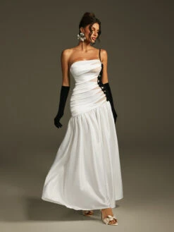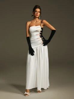 Make a stunning entrance with the Lebana One Shoulder Satin Maxi Dress with Gloves. This elegant ensemble features a sleek satin finish and a graceful one-shoulder design that highlights your silhouette. Paired with matching gloves, it exudes timeless glamour and sophistication, perfect for formal events or special occasions where you want to captivate every gaze.