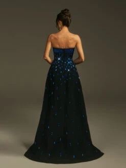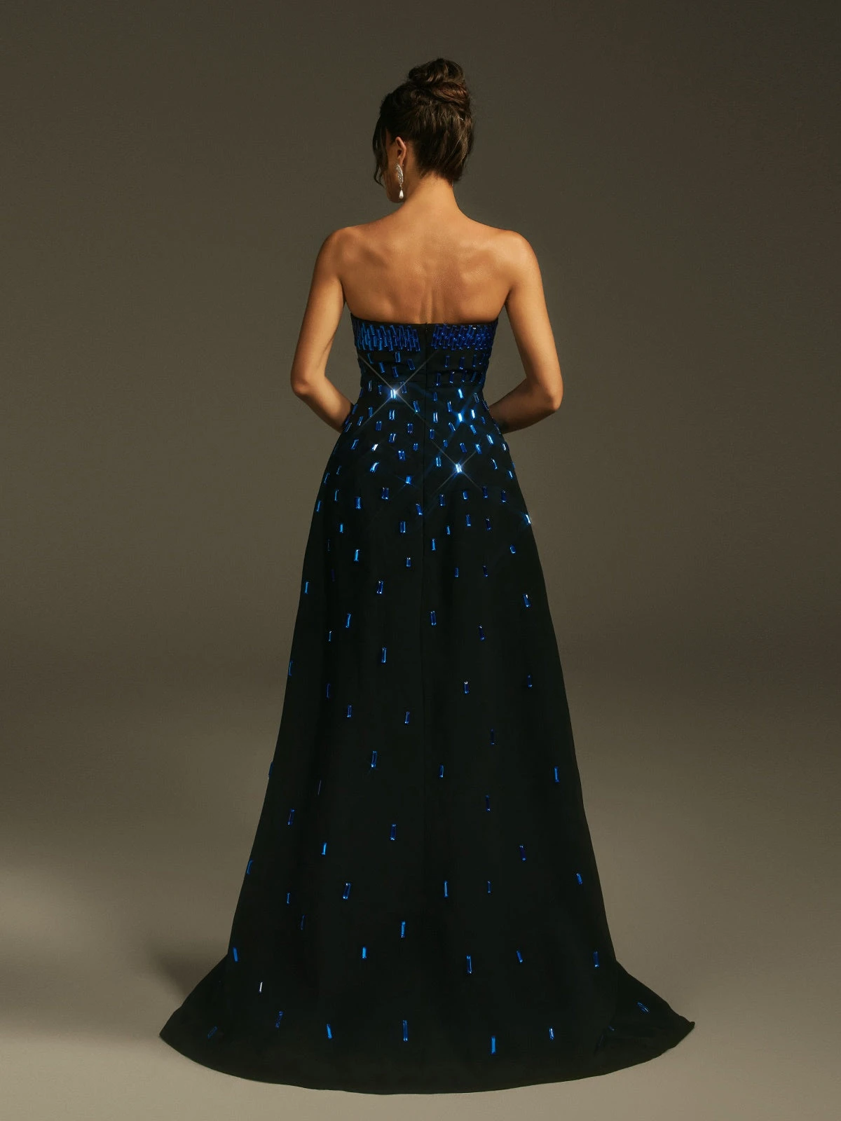 Make a stunning statement with the Leimomi Strapless Crystal Maxi Dress. Designed to highlight your neckline and shoulders, this strapless gown is adorned with sparkling crystals that catch the light beautifully. Its flowing maxi length creates an elegant silhouette, perfect for formal events or special nights out. Experience confidence and glamour in one unforgettable dress.