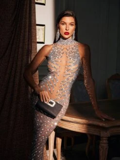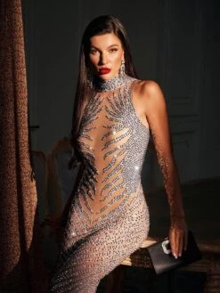 Sparkle and shine in the Letizia High Neck Rhinestone Maxi Dress! This stunning dress features a high neckline and rhinestone accents for a glamorous touch. With its flowy maxi length, it’s perfect for making a statement at any event. Upgrade your wardrobe with this must-have piece!