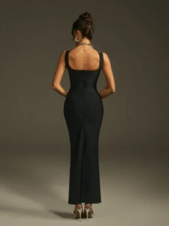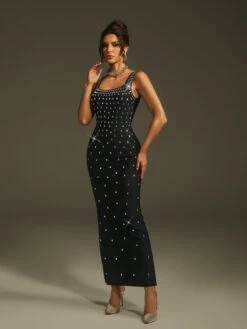 Step into elegance with the Levina Sleeveless Crystal Bandage Maxi Dress. Designed to flatter your figure, its sleek bandage fit hugs your curves while sparkling crystal details add a luxurious touch. The sleeveless cut offers a modern, sophisticated look perfect for evening events or special occasions. Make every moment unforgettable in this stunning dress.