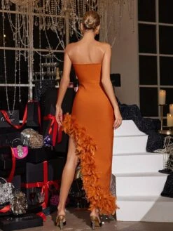 Embody elegance and grace in the Liwy Strapless Feather Spilt Bandage Dress. This stunning dress features a strapless design, feather accents, and a split bandage skirt. Perfect for special occasions and events, this dress will make you feel confident and sophisticated. Elevate your style with this must-have piece!