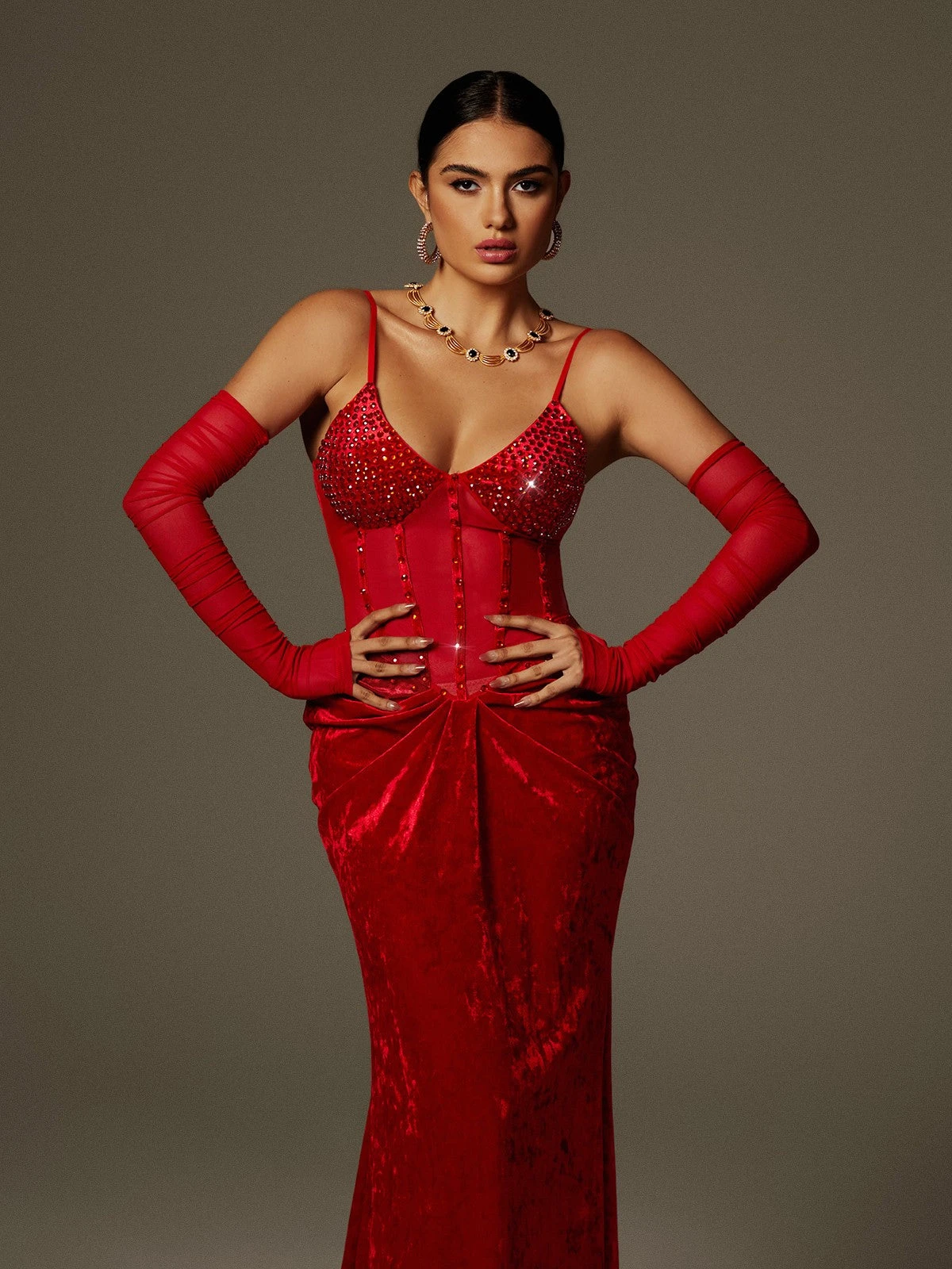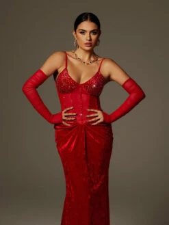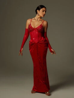 This elegant Lsaac Spaghetti Rhinestone Ruched Velvet Maxi Dress features a beautiful rhinestone detailing and flattering ruched design. Made with high-quality velvet fabric, it is perfect for formal occasions and will make you feel confident and glamorous. Stand out in the crowd with this stunning dress!