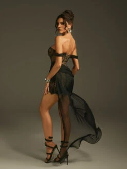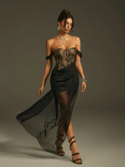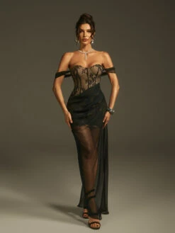 Elevate your elegance with the Marged Off Shoulder Lace Mesh Maxi Dress. Featuring delicate lace and sheer mesh, this dress beautifully highlights your shoulders while offering a graceful, flowing silhouette. Perfect for special occasions, it combines romantic charm with modern sophistication to make you stand out effortlessly.