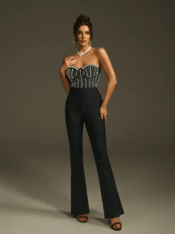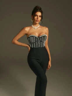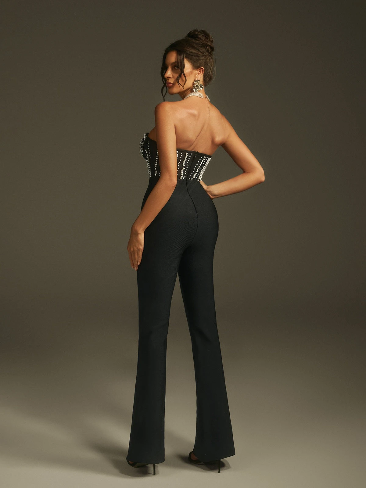 Elevate your style with the Marika Strapless Pearl Bandage Jumpsuit. Designed to hug your curves flawlessly, this jumpsuit features a chic strapless neckline and delicate pearl accents that add a touch of elegance. Perfect for special occasions or a night out, its bandage fit ensures both comfort and confidence. Make a stunning statement wherever you go with this sophisticated and flattering piece.