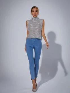 Add a high-shine finish to your with Marilyn Split Chain Chainmail Top In Silver! This dramatic piece features a high neckline, sleeveless look, open sides with chain detailing, keyhole cut out on the back and a sheer chainmail finish. Style it with a black mini skirt and boots for a dressy party look or keep it more casual with denim jeans and heels to let the top do all the talking.