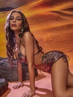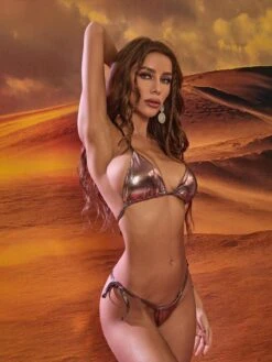 Look glam and sophisticated in the Marla Ruched Bikini Three Piece Set In Rose Gold. With a glossy finish and ruched detailing it will hug your curves perfectly. The set includes a bikini top, briefs and a sarong, perfect for a pool party or beachside getaway.