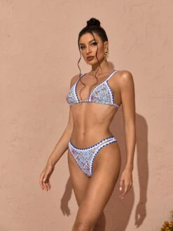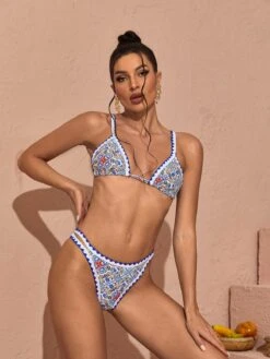 Look your best in the Marleigh Printed Bikini Two Piece Set In Blue. This fashionable two-piece set features a stylish green print, and is perfect for making a stylish statement while enjoying the sun. With its eye-catching design, this set is sure to make a lasting impression.