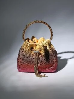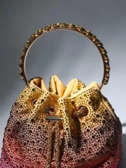 Our signature Mattea Crystal Embellished Bucket Bag In Ombre is crafted from crystal. A statement accessory to love forever, it is finished with a sparkling crystal top handle and a sleek drawstring chain that cinches the supple shape. Take yours with you everywhere.
