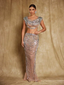 Effortlessly elevate your style with our Mirri Crystal Chain Wrapped Mesh Skirt Set! Featuring delicate crystal chain detailing and a flowy mesh material, this set is sure to turn heads. Perfect for special occasions or a night out, this set will make you feel confident and glamorous.
