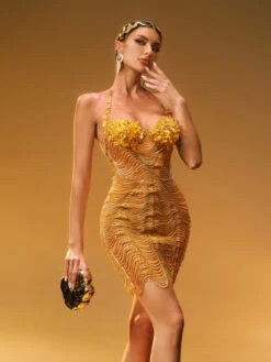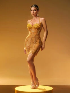 Experience the luxurious and captivating Misael Halterneck Crystal Mesh Mini Dress In Gold! Made from high-quality materials, this dress features a stunning halterneck design and intricate crystal mesh details, sure to turn heads. Perfect for any special occasion, this dress will make you look and feel glamorous. Own the night in Misael!