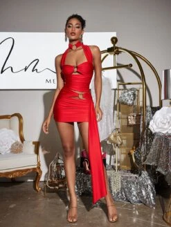 Experience the ultimate elegance and femininity with our Motoko Halterneck Heart Satin Mini Dress. The halterneck design accentuates your curves, while the satin fabric adds a touch of luxury. Show off your romantic side with the heart detailing and feel confident and beautiful in this mini dress.