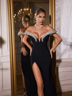 Step into timeless elegance with the Nadim Off Shoulder Pearl Bandage Maxi Dress. This stunning dress features an off-shoulder neckline adorned with delicate pearl accents, adding a touch of sophistication to your look. The bandage design hugs your curves flawlessly, creating a sleek and flattering silhouette. Perfect for special occasions, this maxi dress ensures you stand out with grace and confidence.