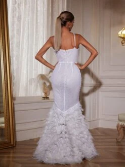 Sweep away in style with the Nele Spaghetti Feather Trimmed Mermaid Maxi Dress. This elegant dress features delicate spaghetti straps and a stunning mermaid silhouette, adorned with feather trim for a touch of glamorous flair. Perfect for any special occasion, this dress is sure to make you feel confident and beautiful.