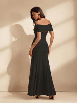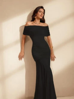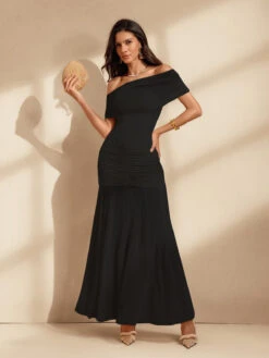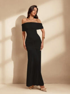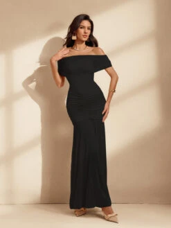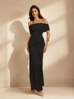 Elevate your wardrobe with the Netia Off Shoulder Ruched Maxi Dress in Black. This elegant dress features a flattering ruched design and an off-shoulder neckline that highlights your silhouette with effortless sophistication. Perfect for special occasions or evening events, it combines comfort and style to ensure you stand out with confidence. Make a timeless addition to your collection with this chic and versatile maxi dress.