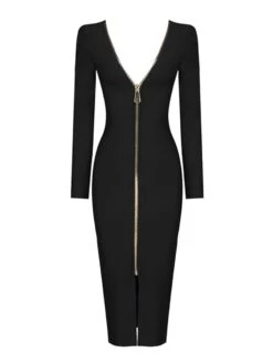 Turn heads wherever you go in this ultra-sexy bandage dress! The Nina Plunge Reversible Bandage Midi Dress is made from stretchy bandage fabric and features a long sleeve silhouette with a plunge V-neck or back, however you want to reverse it, a bold contrasting zipper, and slit details that let you show plenty of skin. Team it with strappy stilettos or pointy-toe pumps for a gorgeous look!
