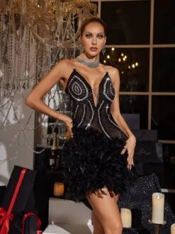 Elevate your style with the stunning Nyxie Rhinestone Feather Trimmed Mini Dress In Black! Featuring intricate rhinestone details and delicate feather trims, this dress will make you stand out in any crowd. Feel confident and chic with this must-have addition to your wardrobe.