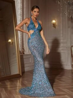 Sparkle and stun in our Orenthal Halterneck Rhinestone Cutout Maxi Dress. The intricate rhinestone detailing and unique cutout design will have you feeling like a true fashionista. Stay effortlessly chic and confident at any event.