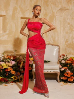 Elevate your style with our Phelia Cutout Lace Draped Maxi Dress. Featuring intricate cutout lace and a flattering draped silhouette, this dress is perfect for a romantic evening out or a special occasion. Make a statement and turn heads in this bold red dress.