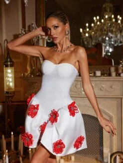 Elevate your style with the Phylo Strapless Flower Bandage Mini Dress in White! This stunning dress features a strapless design and a beautiful flower bandage detail that will surely turn heads. Perfect for any formal or semi-formal event, this dress will make you feel confident, elegant, and chic.