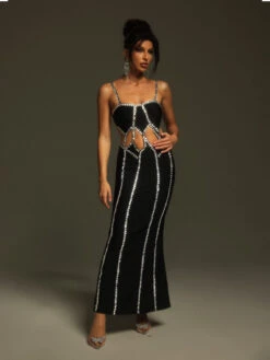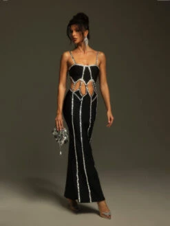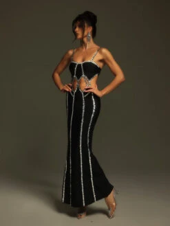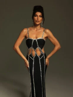 Experience elegance and glamour in our Pinedo Rhinestone Cutout Bandage Maxi Dress! With its stunning rhinestone details and cutout design, this dress is perfect for any special occasion. The bandage material hugs your curves, creating a flattering and confident look. Get ready to turn heads and feel like a queen in this must-have dress!