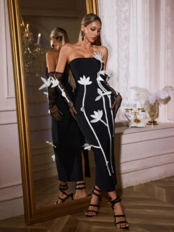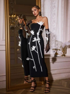 Elevate your elegance with the Qaelyra Strapless Flower Midi Dress, perfectly paired with matching gloves for a refined look. This dress features a flattering strapless design and delicate floral details that add a touch of romance to any occasion. The midi length offers graceful movement, while the included gloves enhance sophistication, making it ideal for weddings, parties, or special events. Step into timeless style and make a memorable impression wherever you go.