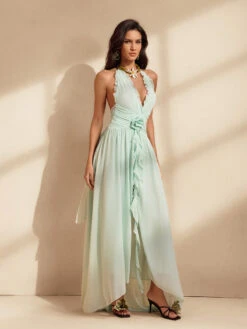 The Qexelle Halterneck Ruffle Maxi Dress in Mint combines fresh color with feminine flair. Its halterneck design elegantly frames your shoulders, while the delicate ruffles add movement and charm. The soft mint shade brings a refreshing, vibrant touch to your look, perfect for warm days and special occasions alike. Crafted for comfort and style, this maxi dress flows beautifully, making it an ideal choice to showcase your confidence and grace wherever you go. Embrace effortless elegance with the Qexelle dress.