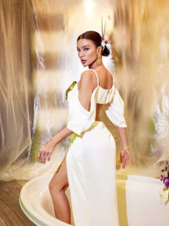 Introducing the Renee Cutout Split Satin Maxi Dress. Crafted from luxurious satin fabric, this dress boasts a stunning cutout design and a high side slit for added elegance and allure. Perfect for special occasions, this dress is a must-have in any fashion-forward wardrobe. Exude confidence and style in the Renee dress.