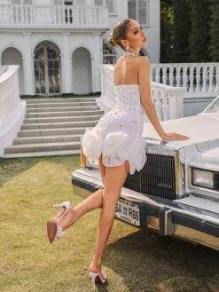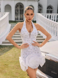 Transform into a goddess with our stunning Rhydian Halterneck Pearl Flower Mini Dress. The halterneck design accentuates your curves while the pearl flower detailing adds a touch of elegance. Perfect for any special occasion, this dress will make you stand out and feel confident!