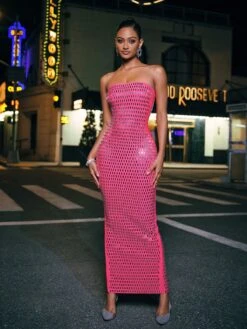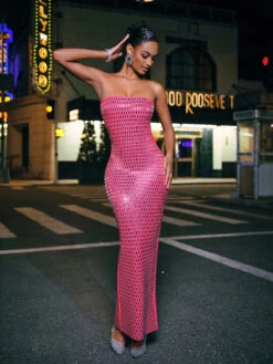 Experience the epitome of elegance with our Ridley Rhinestone Mesh Maxi Dress. The intricate mesh design is adorned with sparkling rhinestones, adding a touch of glamour to any occasion. Elevate your style and exude confidence in this stunning dress.