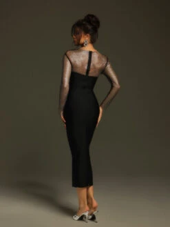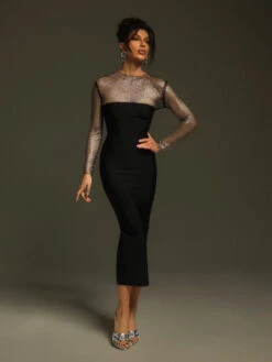 Sparkle and shine in the Ruzevich Long Sleeve Crystal Bandage Midi Dress. This stunning dress features long sleeves and a figure-hugging bandage design, all adorned with sparkling crystals. Perfect for making a statement at any event, this dress will have you feeling confident and glamorous.