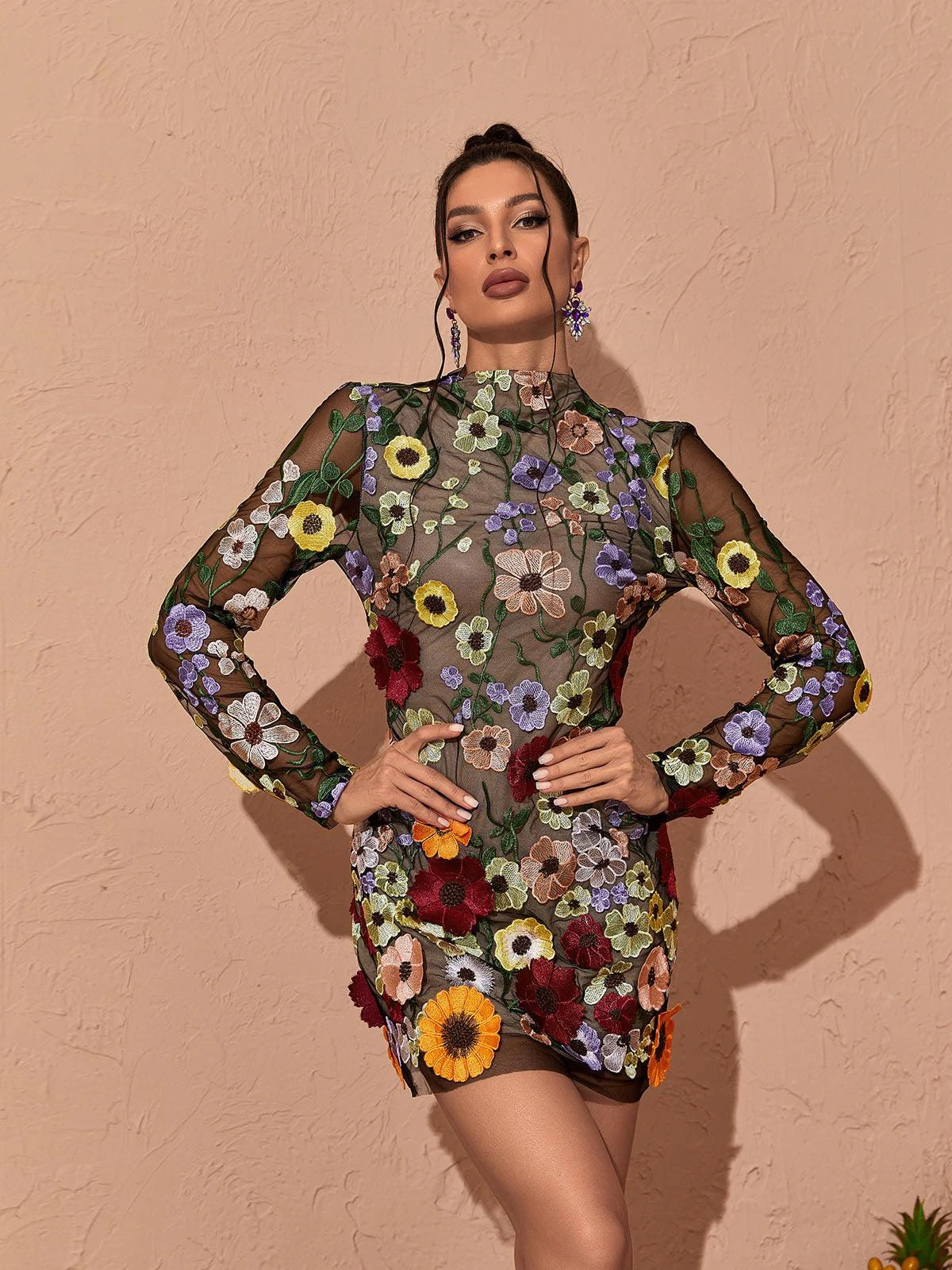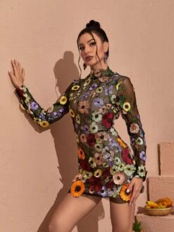 Be on-trend with the Saige Long Sleeve Mesh Flower Mini Dress In Black. This high-style dress features long sleeves and a unique flower mesh design to bring an edgy twist to your wardrobe. Crafted from a lightweight fabric for day-long comfort.