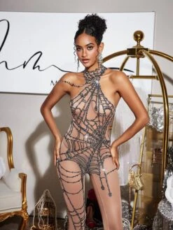 Dazzle and shine with the Siesen Cutout Cobweb Rhinestone Mesh Jumpsuit In Nude. Featuring a unique cutout design and sparkling rhinestone details, this jumpsuit is perfect for making a bold statement. The nude color adds a touch of sophistication, making it versatile for any occasion. Stand out from the crowd and radiate confidence in this stunning jumpsuit.