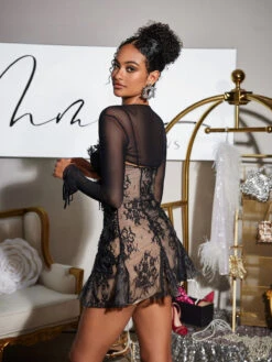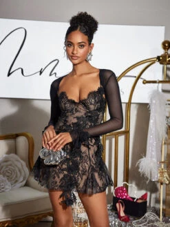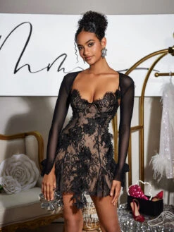 Indulge in timeless elegance and effortless style with the Snorri Spaghetti Lace Mini Dress in a stunning mesh shrug. The delicate lace and spaghetti straps add a touch of femininity, while the mini length shows off your figure. Perfect for any occasion, this dress is a must-have for any fashion-forward wardrobe.