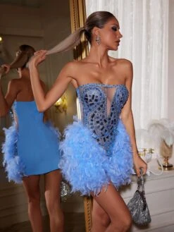 Elevate your style with the Solvay Strapless Acrylic Feather Mini Dress. Made from high-quality acrylic, this dress boasts a chic and sleek strapless design, adorned with feathery accents for a touch of glamour. Perfect for a night out or a special occasion, this dress will make you stand out in the best way possible.
