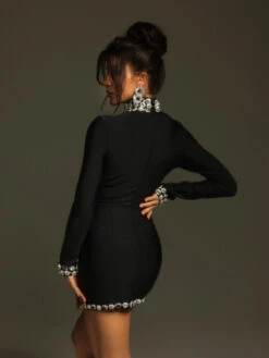 Dazzle and shine in the Svetlana Long Sleeve Rhinestone Bandage Dress. Show off your curves and confidence with its figure-hugging bandage design and stunning rhinestone detailing. Perfect for a night out or special occasion, this dress will make you feel like a star.