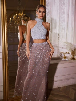Elevate your style with the Taelyra Halterneck Crystal Pearl Skirt Set, a stunning ensemble that combines elegance and modern charm. Featuring a delicate halterneck top adorned with shimmering crystals and pearls, paired with a matching skirt that flatters your silhouette, this set is perfect for making a memorable impression at any event. Experience the perfect blend of sophistication and sparkle that will turn heads and boost your confidence wherever you go.